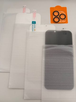Protezioni per iPhone 13 Pro. - 3 protezioni per fotocamera. - 3 Vetri temperati. - 1 Supporto per garantire il posizionamento del vetro. - Adesivi esclusivi. 5 confezioni 22,7€ 1 confezione 6,5€