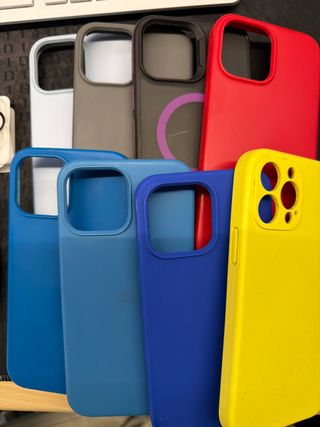 Set di cover per iPhone 13 Pro Max in vari colori. - Cover verde menta. - Cover rossa con logo Apple. - Cover bordeaux con design per fotocamera. - Cover bianca con foro centrale.