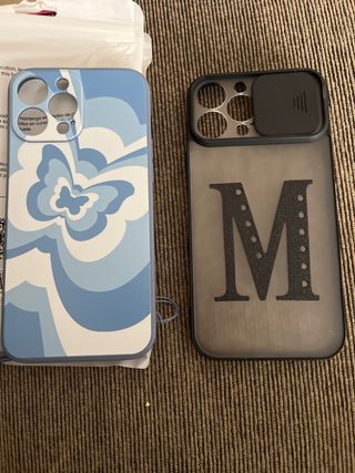 Custodia per iPhone 13 Pro Max con un design a farfalla in toni blu e bianchi. Design stilizzato a farfalla, toni blu e bianchi, include una custodia aggiuntiva con iniziale 'M' e protezione per la fotocamera.