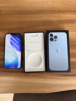 Telefono cellulare iPhone 13 Pro Max con 256GB di spazio di archiviazione. Colore blu alpino. Schermo di alta qualità. Batteria sostituita il 12 gennaio, non di Apple ma con capacità del 100%. Qualità quasi perfetta.
