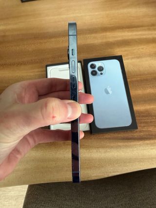 Telefono cellulare iPhone 13 Pro Max con finitura blu e capacità di 256GB. Il telefono è come nuovo, batteria appena cambiata originale - Schermo di alta qualità. - Sistema di tripla fotocamera avanzato. - Design elegante e moderno.