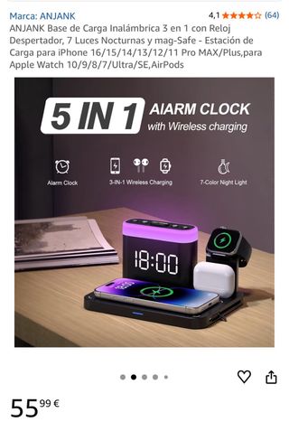 Stazione di ricarica wireless 5 in 1 con sveglia e luce notturna. Base di ricarica a induzione. Compatibile con iPhone 14/13/12/11/Pro/Max. Compatibile con Samsung Phone. Compatibile con Apple Watch 8/7/6/5/SE. Compatibile con AirPods Pro/3/2/1.