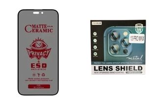 Protettore schermo privacy e antistatico per iPhone 13 Pro Max. - Finitura opaca e ceramica. - Protezione ESD antistatica. - Design in metallo per l'obiettivo della fotocamera.
