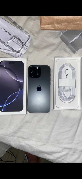 Telefono cellulare iPhone 16 Pro Max in colore nero/grigio. Con la sua scatola originale, incluso il cavo di ricarica e lo strumento per la SIM. Include custodia protettiva trasparente. Accetto cambio con iPhone (13 e 14)