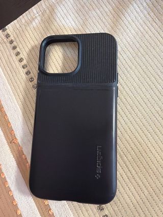 Cover protettiva per telefono mobile del marchio Spigen. Colore nero. Marca Spigen con porta carte, per iPhone 13 Pro Max. Protegge molto bene. Usato poche volte. Sporco, da pulire.