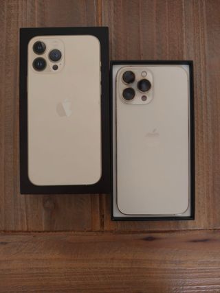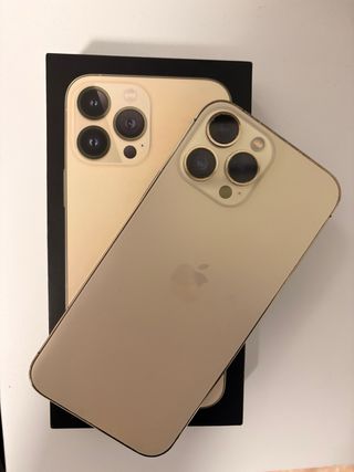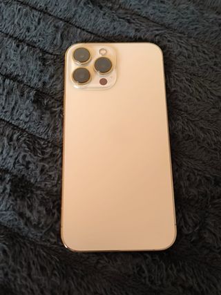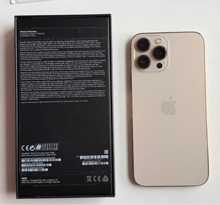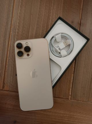 Telefono cellulare iPhone 13 Pro Max in colore oro con la sua scatola. Si trova in ottime condizioni. Si vende con caricatore da 3m e custodia opzionale. Nell'immagine appare con protezione per lo schermo e lenti. Capacità di archiviazione di 128GB. Scatola dell'iPhone. Non ha nemmeno un graffio. Sempre con custodia e protezioni sia sullo schermo che sulle lenti della fotocamera. Batteria all'84% ma dura ancora più di un giorno intero (la batteria del 13 Pro Max è una delle migliori realizzate da Apple).