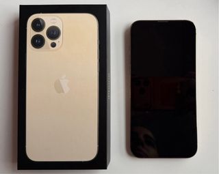 Telefono cellulare iPhone 13 Pro Max con finitura nero e oro. - Schermo da 6,7 pollici. - Sistema a tripla fotocamera. - Chip A15 Bionic. In perfette condizioni Con scatola e cavo.