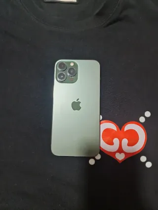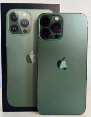 Telefono cellulare iPhone 13 Pro Max in colore verde. - Schermo da 6,7 pollici senza graffi o urti. - Sistema di tripla fotocamera posteriore. - Finitura opaca. - Batteria appena sostituita.