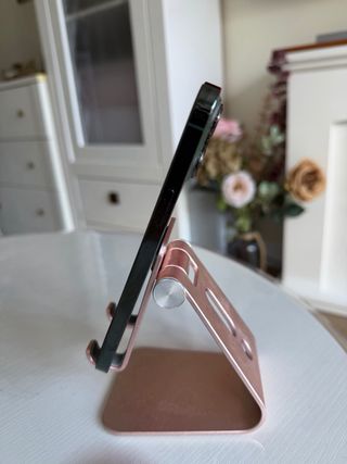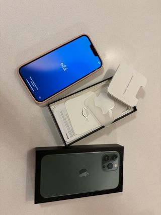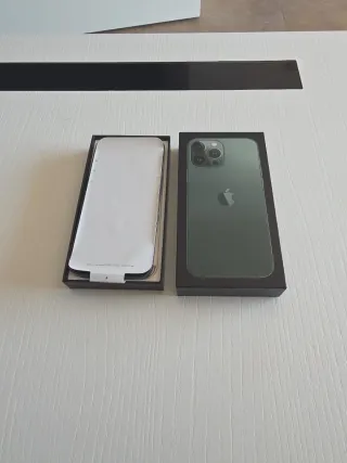 iPhone 13 Pro Max da 128 GB, colore verde, con l'83% della capacità massima. Venduto nella sua scatola originale con documenti, adesivo e cavo originale, include 10 custodie in regalo e batteria esterna. Leggero difetto sul bordo inferiore destro, il resto perfetto.