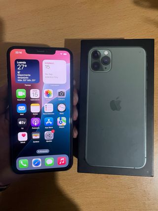 iPhone 11 Pro Max in colore verde e grigio siderale. La batteria è nuova ma non originale. Include la sua scatola originale, cavo di ricarica, custodia protettiva e ricambio del proteggi schermo anti-spia. - Schermo Super Retina XDR. - Sistema di fotocamera tripla professionale. - Chip A13 Bionic.