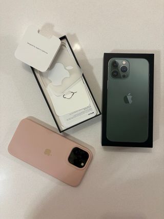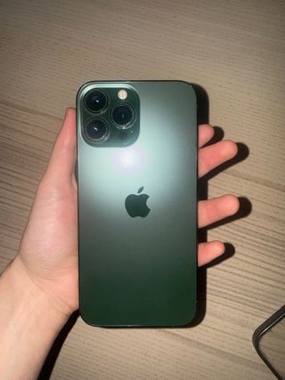 Telefono cellulare iPhone 13 Pro Max in colore verde, con capacità di archiviazione di 128GB. Include custodia beige. Capacità: 128GB, Colore: Verde, Include custodia beige, Viene con la sua scatola originale.
