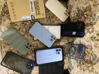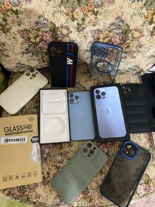 Telefono cellulare iPhone 13 Pro Max in colore blu. Include vari accessori. - Custodia nera con dettagli M. - Custodia trasparente con anello. - Custodia imbottita verde. - Custodia con stampa. - Protezione schermo Glass Pro. - Scatola originale.