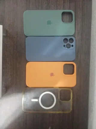 Set di cover per iPhone 13 Pro Max. - Cover verde con logo Apple. - Cover blu con design per fotocamere. - Cover arancione con logo Apple. - Cover trasparente con MagSafe.