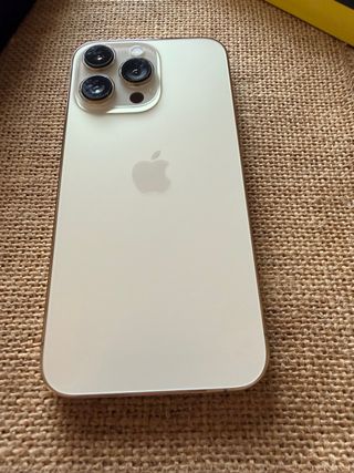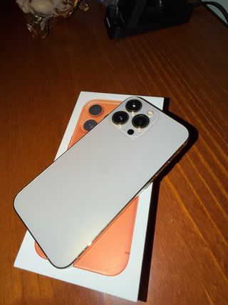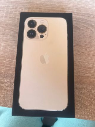 Telefono cellulare iPhone 13 Pro Max in colore oro con la sua scatola. Si trova in ottime condizioni. Si vende con caricatore da 3m e custodia opzionale. Nell'immagine appare con protezione per lo schermo e lenti. Capacità di archiviazione di 128GB. Scatola dell'iPhone. Non ha nemmeno un graffio. Sempre con custodia e protezioni sia sullo schermo che sulle lenti della fotocamera. Batteria all'84% ma dura ancora più di un giorno intero (la batteria del 13 Pro Max è una delle migliori realizzate da Apple).