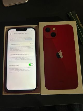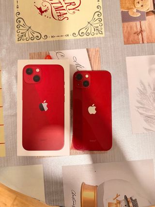 iPhone 13 color rosso acquistato presso El Corte Inglés in Spagna a maggio 2022. Versione colore rosso con 128 GB. Salute della batteria 83%. Funziona tutto perfettamente. Lo vendo perché mi sono comprato il nuovo. Sempre con custodia e protezione per lo schermo e la fotocamera (visibile in foto). In realtà porta ancora la protezione dello schermo che ho applicato il primo giorno perché non ha mai subito alcun urto. L'unica piccola macchia che ha è nella zona del connettore del cavo inevitabile durante l'inserimento e la rimozione (vedi foto).