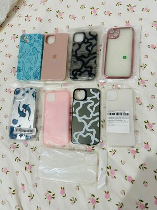 Varietà di custodie per iPhone 14 Plus con diversi design. In regalo consegniamo un proteggi-schermo e un proteggi-fotocamera. - Custodia viola con design personaggio. - Custodia nera con design scacchiera blu e bianco. - Custodia trasparente con design fiamme. - Custodia marrone con scritta Los Angeles California.
