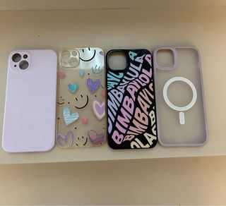 Set di quattro custodie per iPhone 14 Plus, vendute anche singolarmente. - Custodia liscia color lavanda. - Custodia trasparente con cuori e facce. - Custodia nera con testo Bimba y Lola in vari colori. - Custodia trasparente con design MagSafe. - Prezzo per custodia 5€ - Set di 4 custodie 15€