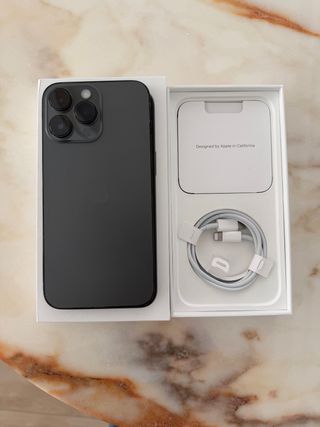 Elegante iPhone 14 Pro Max con acabado en titanio. Un dispositivo potente y con gran capacidad de almacenamiento. - Capacidad de 1TB. - Color negro/gris.