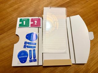 Kit completo per l'installazione di un protettore schermo sul tuo iPhone 14 Pro Max. Include due salviette pulenti (umida e asciutta), adesivo per rimuovere la polvere e guide adesive per una collocazione precisa.