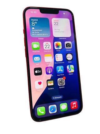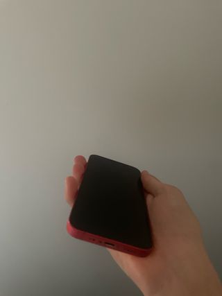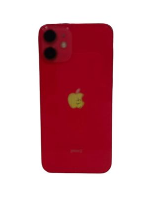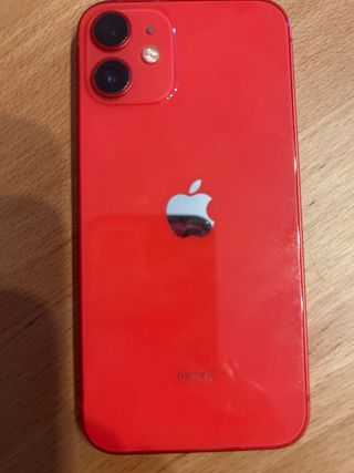 Telefono cellulare iPhone 12 mini in colore rosso. - Schermo da 5,4 pollici. - Sistema a doppia fotocamera. - Chip A14 Bionic. L'unica cosa è che la batteria è al 72 percento.