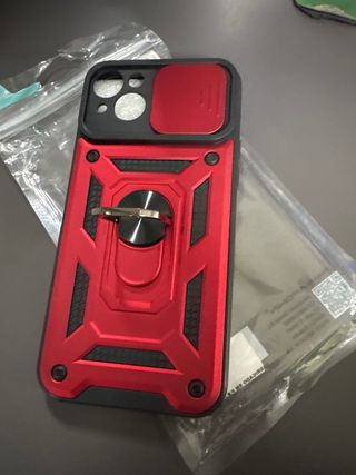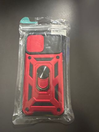 Custodia protettiva per iPhone 14 Pro Max in colore rosso. Design robusto con anello per il dito o per appoggiare il cellulare. Materiale resistente. Con protezione per la fotocamera scorrevole.