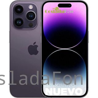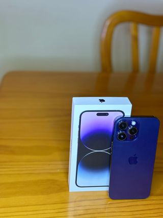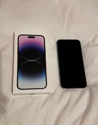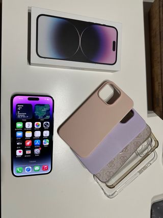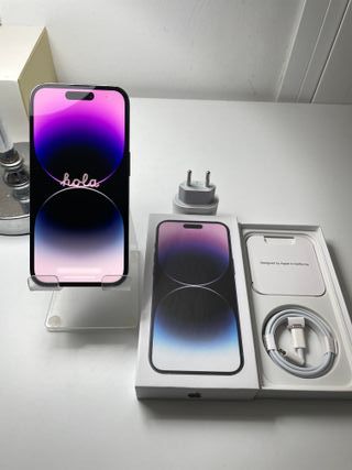 Telefono cellulare iPhone 14 Pro in colore viola. - Fornito con la scatola originale. - Cavo di ricarica. - 2 custodie. - Schermo da 6,1 pollici. - Fotocamera principale da 48MP. - Chip A16 Bionic.