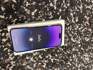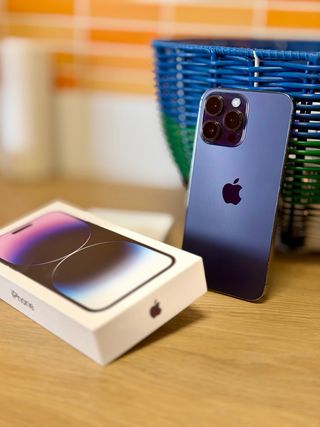 Scatola originale per iPhone 14 Pro Max in colore viola.