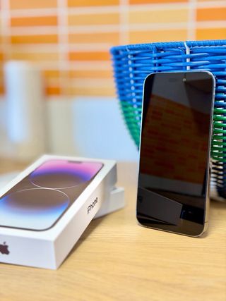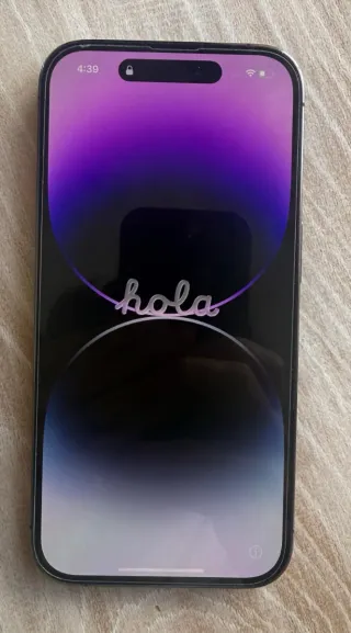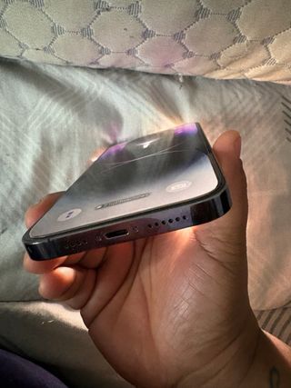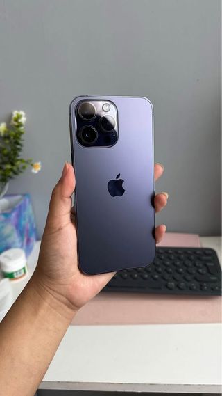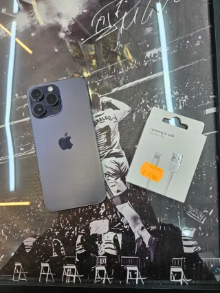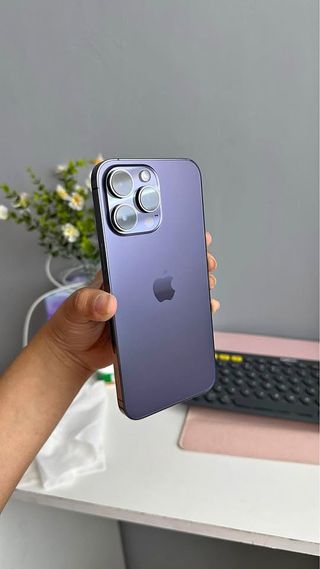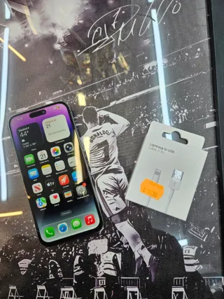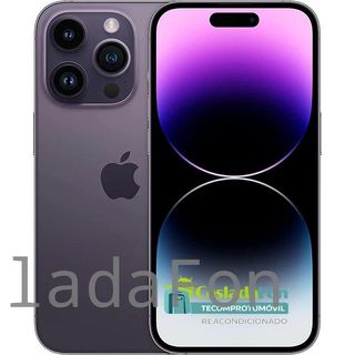Telefono cellulare iPhone 14 Pro con finitura viola. Include custodia originale. Capacità di archiviazione di 128GB. Senza graffi o urti. Perfetto per un uso prolungato.