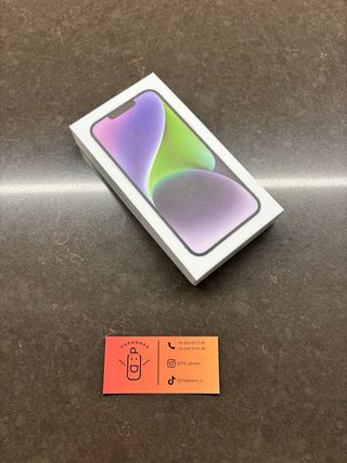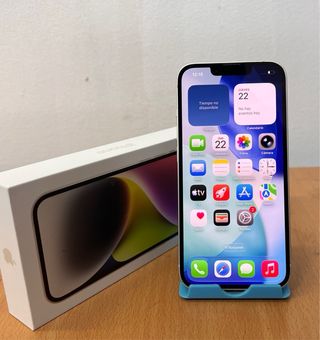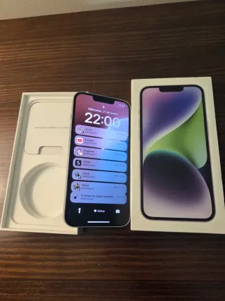 Telefono cellulare iPhone 14 in colore viola. Capacità di archiviazione di 128 GB. Salute della batteria 85%. Esteticamente impeccabile, viene fornito con la sua scatola, cavo e due protezioni in vetro.