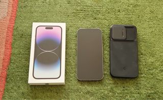 Telefono cellulare iPhone 14 Pro Max con finitura color viola. Capacità di archiviazione di 256 GB. Con caricabatterie e custodia.