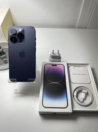 iPhone 14 Pro da 256 GB in colore viola scuro. Sembra grigio scuro. In ottime condizioni, senza graffi né sullo schermo né sulle fotocamere. Ciò che si nota nelle foto è solo sporcizia. Batteria al 79%. Include cavo di ricarica, un nuovo vetro temperato e tutte le custodie presenti nelle foto. Si vende per l'acquisto di un nuovo iPhone.