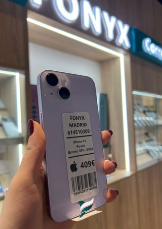 🚨 SOLO PER I PIÙ VELOCI! 😱 iPhone 14 128GB 🔹 Colore: Viola 🔋 Batteria: 89% 🎁 Include custodia e cavo di ricarica 🛡️ Garanzia: 12 mesi 📍 Calle de la Princesa 71, Madrid 🏬 FONYX 📞 614 510 309