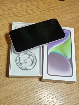 iPhone 14 con finitura viola. Capacità di archiviazione 128 GB. Molto curato, sempre usato con protezione dello schermo e custodia dal primo giorno. Funziona perfettamente, senza difetti. Include cavo di ricarica originale. Batteria al 95%. Viene fornito ripristinato e pronto per l'uso. Motivo della vendita: cambio a un altro modello. Prezzo negoziabile. Solo persone serie.
