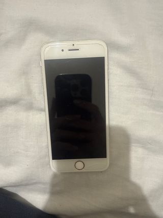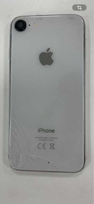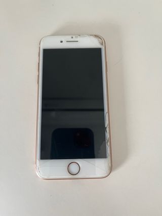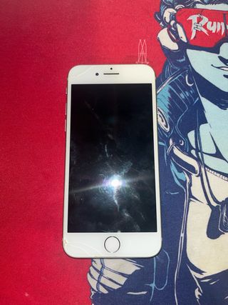 Telefono cellulare iPhone 8 in colore bianco. Presenta alcune crepe sullo schermo e nell'angolo in basso a destra. La batteria non dura molto ma funziona perfettamente. - Schermo da 4,7 pollici. - Fotocamera posteriore da 12 MP. - Chip A11 Bionic.