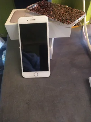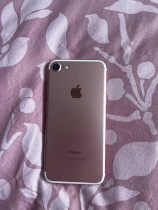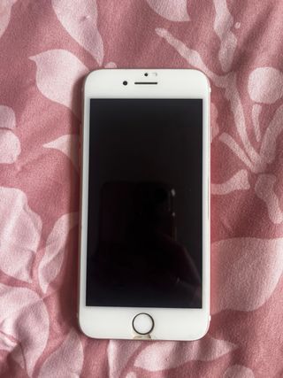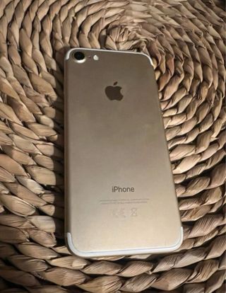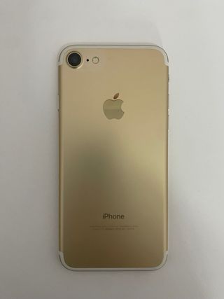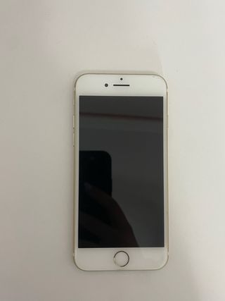 Telefono cellulare iPhone 7 in bianco e oro. Il pulsante fisico del menu non funziona, si utilizza l'opzione sullo schermo. - Schermo da 4,7 pollici. - Fotocamera posteriore da 12 MP. - Capacità di archiviazione di 128 GB. - 3 custodie in più.