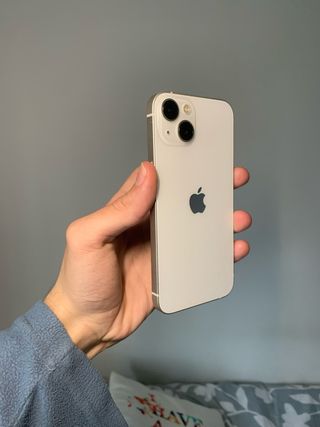Telefono cellulare iPhone 13 in bianco con 128GB di spazio di archiviazione. Capacità della batteria al 100%. Include 4 custodie.