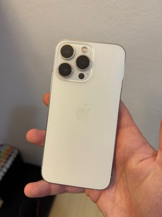 iPhone 13 Pro bianco da 128 GB. Usato ma perfettamente funzionante. Ha il 72% di salute della batteria. Include la scatola originale con 4 custodie e 2 proteggi-schermo (1 anti-spia). Ha già un proteggi-schermo installato. Presenta segni di usura dovuti al tempo di utilizzo. Design elegante e moderno. Finitura in vetro e acciaio inossidabile.