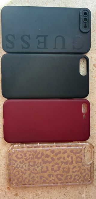 Set di 4 cover per iPhone 7 Plus e 8 Plus. - Cover nera con logo Guess e dettaglio della fotocamera. - Cover nera liscia. - Cover bordeaux. - Cover trasparente con stampa leopardata. Vendute anche separatamente a 2€ ciascuna.