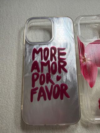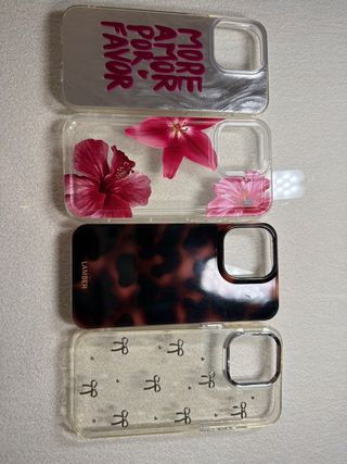 Confezione di quattro custodie per iPhone 15 Pro Max. - Custodia trasparente con design floreale. - Custodia trasparente con fiocco e glitter. - Custodia con stampa leopardata madreperla. - Custodia argentata con scritta 'More Amor Por Favor'.