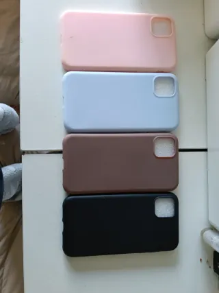 Set di quattro custodie per iPhone 11 in diversi colori. Prezzo di ogni custodia è di 10€. - Custodia rosa - Custodia azzurra - Custodia marrone - Custodia nera