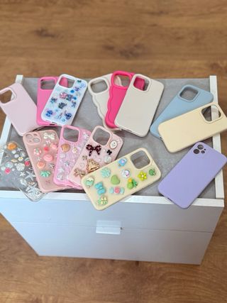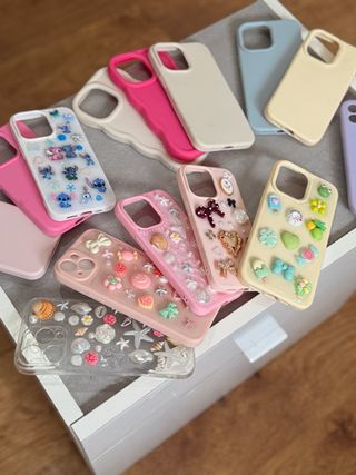 Set di cover per iPhone con diversi design. - Cover con stampa floreale blu. - Cover liscia in blu chiaro. - Cover con personaggio di Stitch. - Cover con stampa leopardo e dettagli brillanti. - Cover liscia in bianco con cuore. - Cover trasparente con nastri bianchi. - Cover bianca con nastri brillanti. - Cover liscia in rosa. - Cover trasparente con bordo brillante. Vendute separatamente, 4 euro ciascuna.