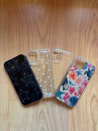 Set di quattro custodie per iPhone 13. - Custodia nera con stelle. - Custodia trasparente con cuori bianchi. - Custodia con design marino. - Custodia con brillantini.