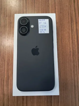 Telefono cellulare iPhone 16 con finitura nera. Capacità di archiviazione di 128GB. Batteria al 100% dopo 4 mesi di utilizzo.