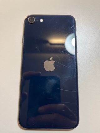 Telefono cellulare iPhone SE 3ª generazione. Colore nero. Segni sul retro e su 3 angoli (vedi foto). Capacità massima della batteria: 84%. Schermo da 4,7 pollici. Chip A15 Bionic. Fotocamera posteriore da 12 MP. Compatibile con 5G.