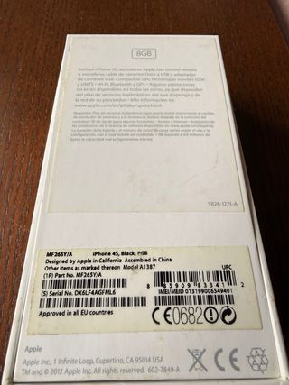 Telefono cellulare iPhone 4S nella sua confezione originale. - Modello: iPhone 4S - Colore: Nero - Include scatola originale, in perfette condizioni. - Include anche documentazione originale, con adesivi Apple. - Si avvia bene, la batteria dura poco. - Non include cavo né caricabatterie.