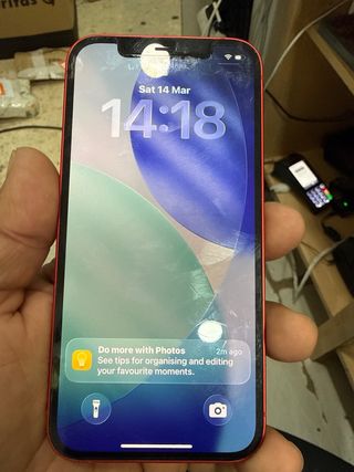 Telefono mobile iPhone 13 in colore rosso. Funziona perfettamente. Ha un urto sullo schermo ma non influisce sul funzionamento. Batteria in ottime condizioni. Utilizzato meno di un anno. - Schermo da 6,1 pollici. - Fotocamera doppia da 12 MP. - Chip A15 Bionic.