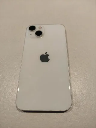 Telefono cellulare iPhone 13 in colore bianco. - Schermo da 6,1 pollici. - Fotocamera doppia da 12 MP. - Chip A15 Bionic. 82% di batteria. Non ho la scatola ma il caricabatterie sì.