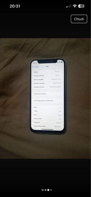 Vendo iPhone 12 mini con 128GB di memoria. Ottime condizioni. - Modello: iPhone 12 mini - Capacità: 128 GB - Versione iOS: 16.6.2 - Numero di serie: FDDQQTX6R0RP - Foto: 584 - Applicazioni: 40 - Spazio disponibile: 87.83 GB