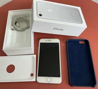 Telefono cellulare iPhone 7 con finitura argentata. Capacità di archiviazione 32GB. Con scatola originale, caricabatterie originale, vetro temperato e custodia per cellulare. Ottimo stato, schermo perfetto. Batteria inferiore al 70%.