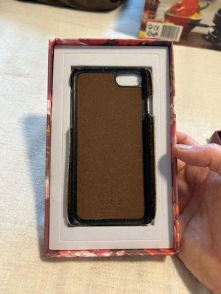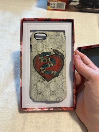Custodia per iPhone 7 con l'iconico design di Gucci. - Stampa GG caratteristica del marchio. - Dettaglio di serpente avvolto in un cuore rosso. - Presentata nella sua scatola originale.